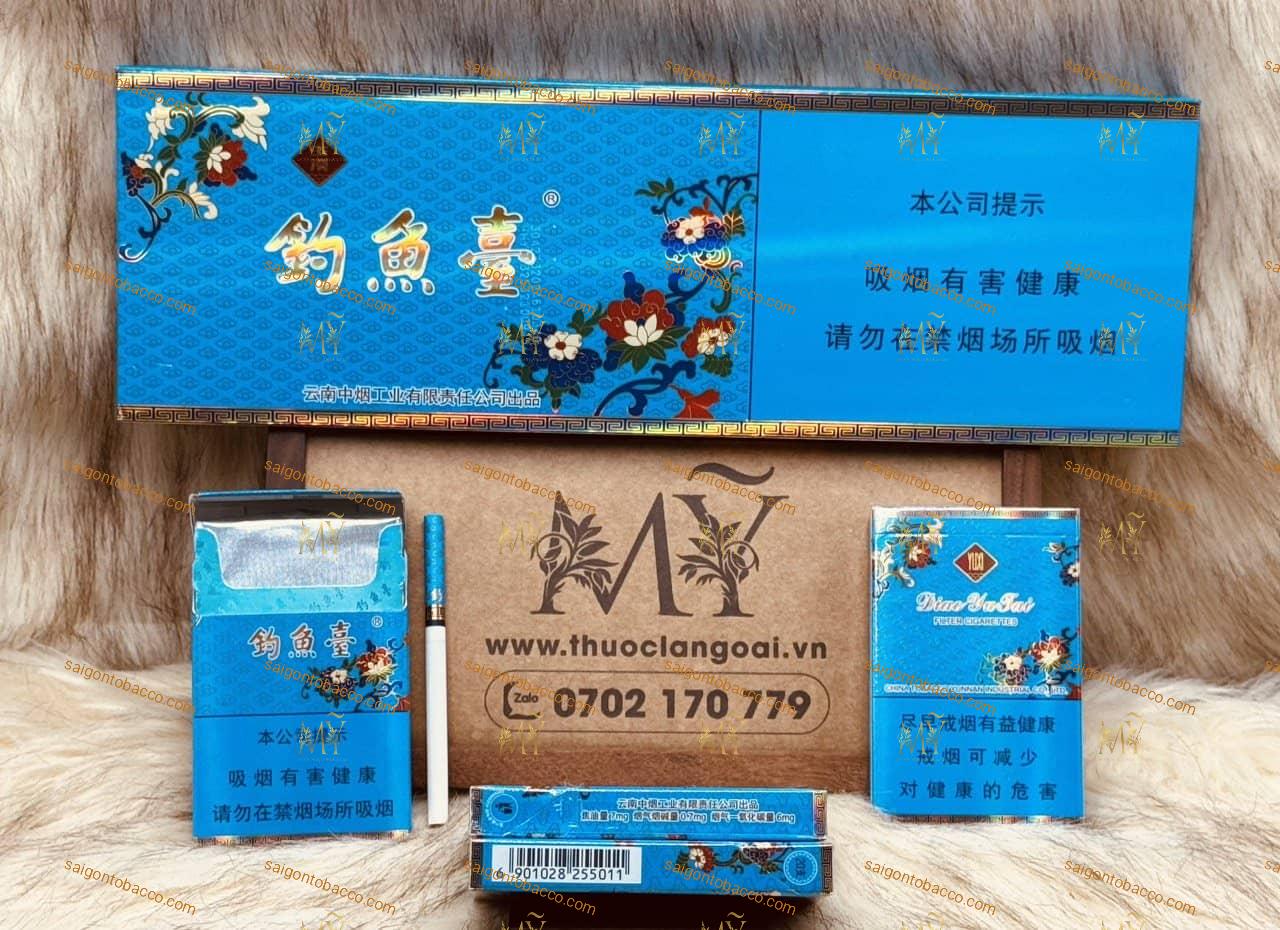 - Thuốc lá Diaoyutai (mỏng 84mm) nổi bật với thiết kế sang trọng và tinh tế. Với chiều dài 84mm và đầu lọc dài 25mm, sản phẩm mang đến trải nghiệm hút thuốc êm ái và dễ chịu. Hộp thuốc có màu xanh lam chủ đạo, được trang trí bằng các hoa văn và logo thương hiệu tinh xảo, tạo nên vẻ đẹp thanh lịch và quý phái. Diaoyutai được đóng gói trong hộp carton cứng, mỗi hộp gồm 20 điếu, phù hợp với những ai yêu thích sự sang trọng và chất lượng cao.