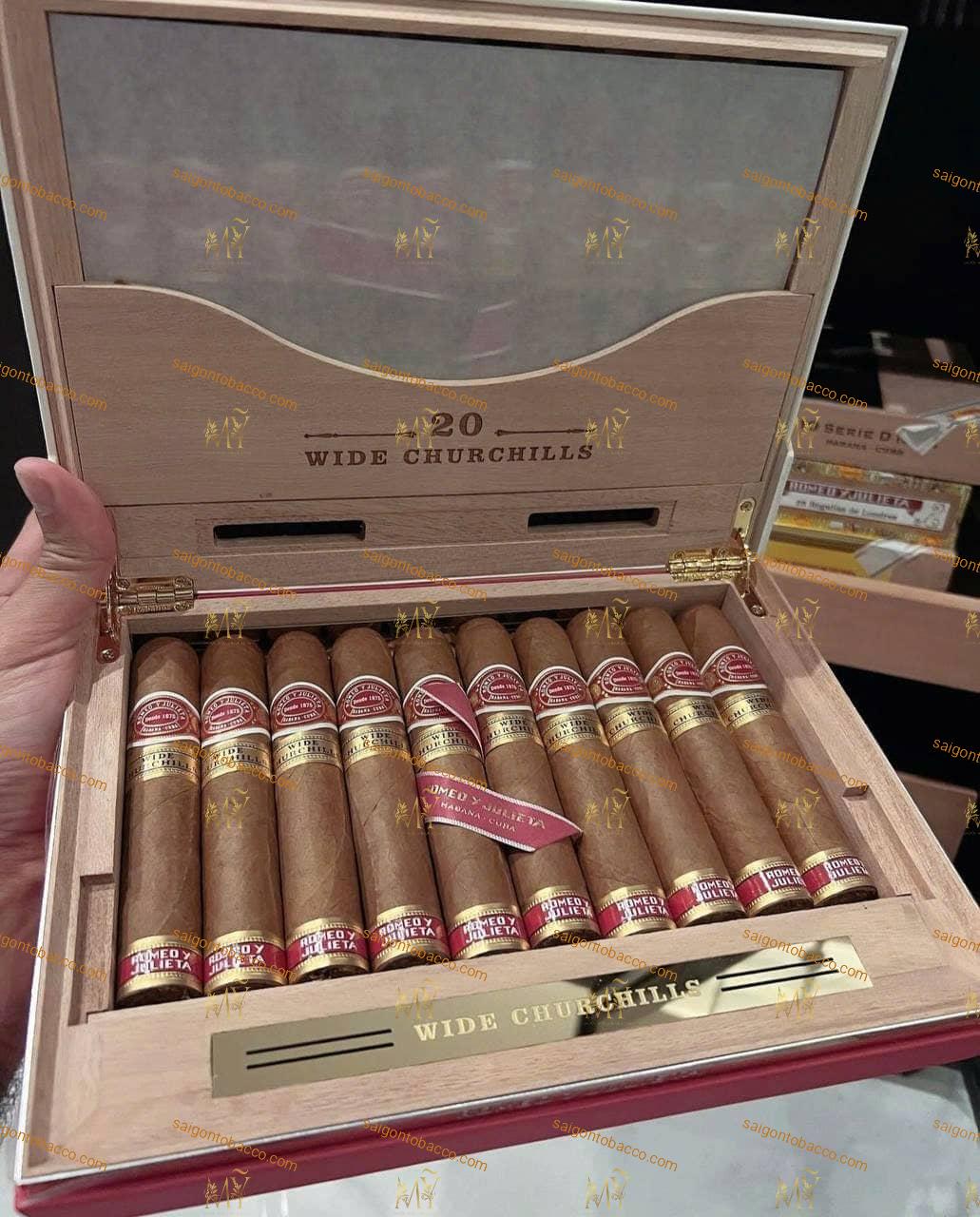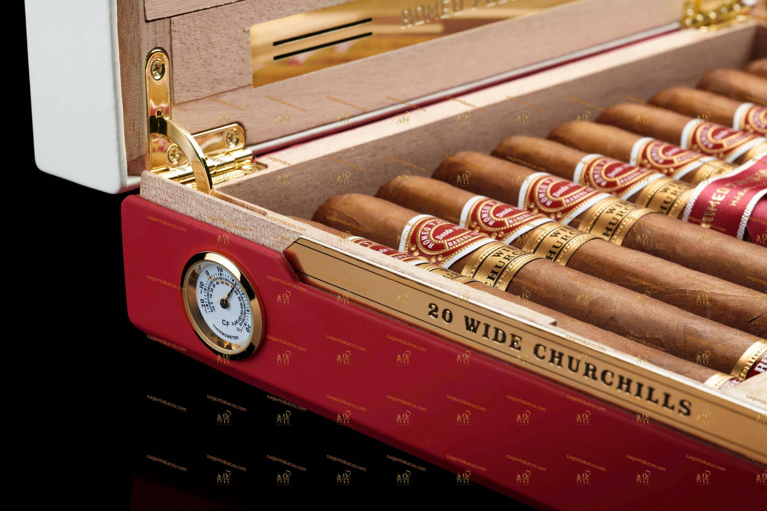 Hộp giữ ẩm du lịch Romeo y Julieta Wide Churchill này là món quà hoàn hảo cho người sưu tầm. Được sản xuất độc quyền cho ngành Bán lẻ du lịch, hộp giữ ẩm du lịch này được đựng trong hộp gỗ sơn mài màu đỏ và trắng đẹp mắt được trang trí bằng các điểm nhấn màu vàng. Nó được trang bị đầy đủ một máy đo độ ẩm, giúp giữ cho Wide Churchills luôn tươi và trong điều kiện tối ưu nhất. Mỗi điếu xì gà có thêm một dải chân để phân biệt với sản phẩm thông thường.
